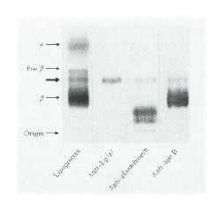 リポフォーに出現するミッドバンドは,実方ら2)の研究では,少なくとも1つはLp(a) であり,その他レムナントリポ蛋白質も考えられると述べています。ただ、高Lp(a) 濃度の患者のリポフォーの電気泳動像上に必ずしもミッドバンドが出る訳ではなく, まだ不明点があります。千葉大学の斉藤 康先生は3),ミッドバンドの組成は単一でな く、IDL,VLDL,Lp(a),レムナント,さらにLDLの一部も含まれると説明しています。
