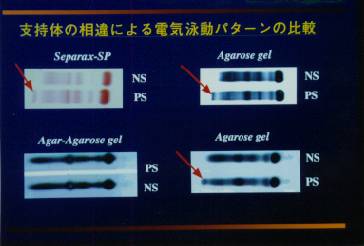 これは、支持体の相違による電気泳動パターンの比較です。セパラックス−SP及びアガロースゲルではslow−γ位にMバンドが出現しています。