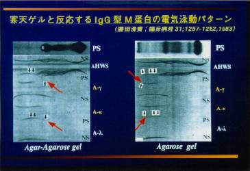 ![]() | これは、12年前に私達が寒天ゲルと反応するM蛋白例ということで、臨床病埋に報告したものなんですが、この場合も同じようにslow−γ位にM蛋白が出現しています。アガー・アガロースゲルを便った免疫電気泳動で観察してみますと、スライドのように塗布点にM蛋白が残ってしまい、慣れている人でないと見逃してしまう危険性があります。この症例では、塗布点のM蛋白を見逃して、Bence−Jones蛋白も出現していましたので、Bence‐Jones型多発性骨髄腫として治療されていた症例なんです。 これは普通、検査室側でその矛盾に気がつかなければいけないんですが、臨床の先生から分画でslow−γ位の方にM蛋白があるのに、どうして免疫電気泳動ではBence‐Jonesの位置がmid−γ位なんですかという指摘があったんです。それで疑間に思い、我々のところに依頼がきた症例です。これはやはり検査室サイドで気がつかなければならないことだと思います。 |