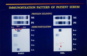 アガロースゲルフィルムを用いた免疫固定電気泳動では、3本のMバンドともIgA-λ型と同定されましたが、使用する抗血清のメーカーにより、L鎖の抗λ鎖抗血清で異なったパターンが得られました。スライド右側の、MBLの抗λ抗血清を用いた場合、M-1のバンドがここに固定されませんでした。