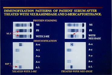 ![]() | スライド左に示しますように、2-メルカプトエタノール(2-ME)処理した患者血清は、アガロースゲルフィルムの免疫固定電気泳動を行うことにより、M-3のバンドは消失することが確認されました。このことからM-3のバンドは、IgA型M蛋白の重合体であることが推定されました。 また、2-ME処理をすることにより、λ型ベンスジョーンズ蛋白(BJP)と思われるバンドが検出されました。 スライド右側にノイラミニダーゼ(Neu-dase)処理した患者血清の電気泳動を示します。ノイラミニダーゼ処理する事により、M-1のバンドは陰極側へ移動しています。M-1のIgA型M蛋白は、シアル酸によって修飾されたものであることが推定されました。 |