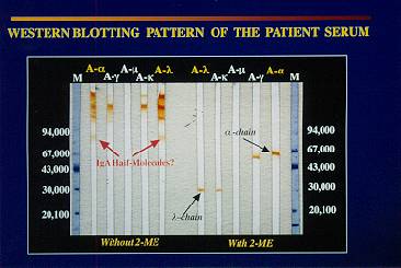![]() | 患者IgAの分子量についてWestern blotting分析を行いました。12.5%マルチゲルを用い、患者血清をSDS-PAGE後、PVDF膜に電気転写を行い、特異抗体を反応させたものです。スライドに矢印で示しましたように、患者 IgAを構成するα鎖は分子量約65000、λ鎖は28000とほぼ正常IgAと同じ分子量でしたが、2-ME非存在下、赤の矢印で示しましたように、分子量92000の半分子IgAと思われるバンドが検出されました。また、抗α鎖、抗λ鎖、抗血清との反応性から、患者IgAはかなり分子重合を起こしていることが示唆されました。 尚、この症例の患者は、MCNU-VMP療法を2クール施行後、マルク検査にて plasma cellが入院時33.2%に比べ2.7% と減少し、IgAは439 mgと軽快し、4月22日退院となりました。 |