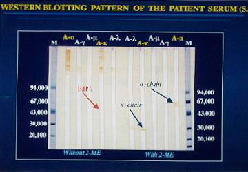 ![]() | 患者IgAの分子量についてwestern blotting分析を行い調べました。方法は、12.5%マルチゲルを用いて患者血清をSDS-PAGE電気泳動後、PVDF膜に電気転写を行い、特異抗体を反応させました。 青の矢印で示したように、患者IgAを構成するα鎖は分子量約65000、λ鎖は28000とほぼ正常IgAと同じであったが、2-ME非存在下で、赤の矢印で示したように、分子量約48000の二量体の遊離κ鎖が観察されました。また、抗α鎖、抗λ鎖抗血清との反応性から、患者IgAはかなり分子重合を起こしていることが示唆されました。 |
