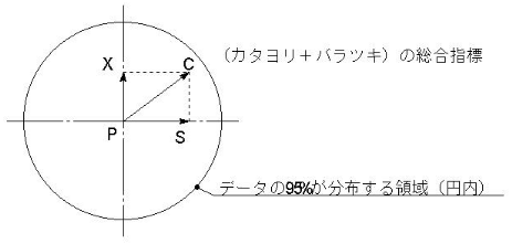 が評価指標(カタヨリおよびバラツキ)となる(図1参照)。最後に、カタヨリとバラツキのベクトルを合成した物を「カタヨリ+バラツキ」とし、最終的な評価の指標とした(図2参照)。