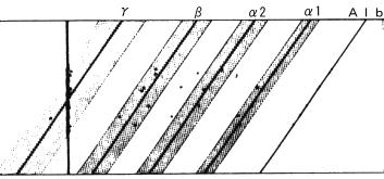| 次に相対易動度、これも次の機械化のプログラムに必要になってくると思いますが、先程松崎先生が免疫固定法でもって各蛋白成分の易動度を相対的に表しておられました。これを我々も前からやっていました。 α2分画とネフローゼ症候群と関係するのではないかという事をいい出しましたが、これは濾紙の時代ですから、殆ど臨床的に意味が無くなりました。濾紙電気泳動の時代でさえも、あれ程分離の悪い時代でも、α2マクログロブリンが非常に増えてくるとα2分画のピークのモードがちょっとずれると、いうような事が判りましたが、更にセア膜電気泳動法の時代になりますと、これがより精密になり、コンピュータでもって解析するというような報告も1〜2出ている訳です。 |