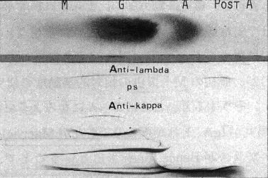 ![]() | 次にM蛋白であるというふうに同定するためには、もう1つの性質を満たす必要があります。免疫学的均一な蛋白を示すことですが、これには例外があると申しました。 先程のBence Jones蛋白とheavy chain proteinというのは例外で、その他称なものもありますけども大体よく遭遇するものでは、それ以外はとにかく均一な蛋白帯を作ります。それだけではM蛋白帯とは同定することはできませんで、もう1つ免疫学的に単一な種類のL鎖又はH鎖であるということを証明する必要があります。これは単一なバンドが2つ重なっています。その場合にもしlight chainを持っているM蛋白であればlightchainの免疫学的な特性を調べてκかλか、どちらか一方であるということを証明すればいいわけです。 |