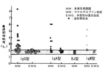 その不均一なporosity多孔性をかなり補正したためにS又はSPの膜では、こういう傾向はほとんど出なくなったわけです。 実はその波形帯を示し、これは血清粘度、水の粘度を1として血清の粘ちょう度がとれ位かを測って、縦軸にとった図ですが、IgG型のmultiple myeloma骨髄腫、EMGというのは良性M蛋白血症を見ますと、骨髄腫の場合にIgGもIgAもIgMも粘ちょう度が高くなるのです。悪性の場合の方が。良性の場合には、ほとんど粘ちょう度は上がらない。しかも粘ちょう度が上がっている症例のうち、この半分黒く塗りつぶしたのは波形帯を示したものです。まれに良性でも波形帯傾向を示すものがありますが、粘度が2.5以上になるとはぼ波形帯が出てきたというわけであります。 |