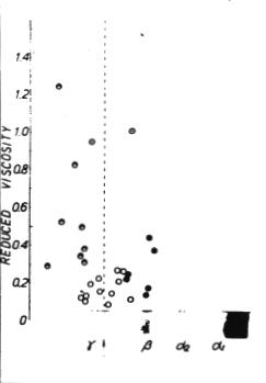 Reduced viscosity 還元粘度というのは、1g当りの蛋白でどれ位粘ちょう度が高くなるかという指数なんですが、それを見ますとマクログロブリン血症とIgG型のM蛋白で波形帯を示したものが圧倒的に多く、しかもslow-γ寄りに集中しているというのはIgG型です。IgM型は、もともとマクログロブリンは分子が大きいですから固有粘度は高いのです。このようにして、slow−γ寄りに泳動されて波形帯を示すIgG型、M蛋白というのはまず骨髄腫で、しかも粘ちょう度が非常に高くなるという性質を持っています。 |
