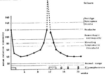 粘ちょう度が高いということは臨床的にはものすごく重大なことなのです。もしもそういった粘ちょう度の高くなる蛋白が出てる場合には、粘ちょう度がだいたい4よりも高くなると臨床症状がそろそろ出てきます。それは血管の中を血液が流れにくくなるからで、最終的にはけいれんを起こしたり或は中枢神経系の症状まで起こして致死状態になります。そこで、粘ちょう度が正常よりも高くなったらいち早くplasma exchange 血しょう交換をしないとその患者さんは、やがて死を迎えることになります。 こういうこともあって、電気泳動でもって、ある程度危険信号を察知できますので、臨床家とよく相談した上で、血液或は血清の粘ちょう度を測定して、適切な治療に反映させて下さい。 |