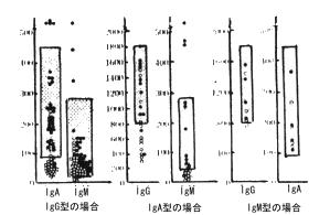 次にM蛋白以外の免疫グロブリンがどうなるかということであります。一言で言えばIgGのM蛋白血症であればIgA、IgM、すなわちM蛋白以外の免疫グロブリンというのは悪性の場合には低くなるということなのです。ですからもしも、M蛋白血症がある場合には、免疫グロブリンが下がっていたらまず悪性を考えなさいと、いうことになります。もしもいろいろな臨床的な検索をしても、なおかつ骨髄腫、マクログロブリン血症などが見つからないで、しかも免疫グロブリンを定量すれば、低いという時には、これはpotentially malignant 潜在的悪性疾患として、3ヶ月ないし半年毎にフォローアップが必要です。いつ何どき骨髄腫などの悪性化が起こるかわからないということで、注意深く臨床的に観察する必要があります。これについてはマクログロブリン血症ではさほどその傾向が強くありません。 |