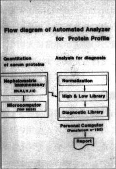 | 実はこの血清の蛋白分画をやります前に、これも十数年前でありますけれども自動分析装置によって血中の蛋白を定量することができるという事で、最初に行ったのがテクニコンのオートアナライザーという装置を使って何とかできないかという事で始めたのが病態解析のはしりであります。その話を最初に少ししてみたいと思います。その後全自動のネフェロメータの装置等も出てまいりましたので、それを使って数年間やりました。この原理は血中の特定蛋白を選び、それを定量的に測定します。これをマイクロコンピュータに移し、もう一つのコンピュータにそのデータを入れまして、ここに書いであるような三つのアルゴリズムを使って最終的にコンピュータでレポートを書くという風な事を考えた訳です。この基礎になっているのは勿論"河合の分類"でありまして、それを蛋白定量でもって何とかできないかと言う事で始めた訳です。 |