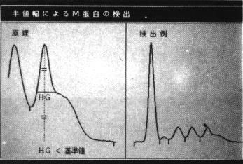 これは"半値幅"でありまして、先程申し上げましたように、丁度ボトムからの高さの半分の部分での幅がとれ位になっているか、この幅がある基準値を越して非常に狭くなっている場合にM蛋白として検出しようという訳であります。これは比較的少量のM蛋白でも検出が可能となりました。