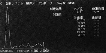 微量のM蛋白もわれわれのアルゴリズムで検出できまして、これはslow-γ位に微量出現したM蛋白であります。これはIgG型の微量M蛋白でした。但しこの例では6分画ということで検出できておりますので、この程度であれば、肉眼的にも「怪しい」という事で判かりますけれどもアルゴリズムによって誰でもM蛋白であると推定する事ができます。