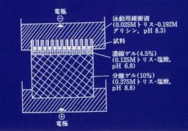 先ずスラブ電気泳動という方法です。現在はゲルサイズが小さくなって、大体8×8cm角で厚さ1ミリの中にゲルを作るようになっています。これは均一なゲルで、後でお話しします、ディスク法の原理に基づいており、分離ゲル、濃縮ゲルがあります。緩衝液はトリス−グリシンでpHを変えて分離能を上げております。