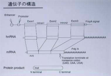 ![]() | DNA上1つの蛋白をコードする領域を遺伝子と呼び、mRNAがそこから合成されます。真核細胞の遺伝子の構造を図に示します。RNAポリメラーゼはDNA上のプロモーター領域を認識し、RNA合成を開始します。hnRNAが合成された後、イントロン部分がとり除かれエクソンから成るmRNAが作られ蛋白合成に利用されます。エクソンは幾つもあります。エクソンが30から40またそれ以上のもあります。 mRNAの全ての領域が蛋白質をコードしているかと言ったらば、違います。mRNAの中に、AUG、つまり、メチオニンをコードするコドンがあり、そのうちの一つから蛋白合成が始まり、終始コドンまでアミノ酸が付加していきます。この蛋白をコードしている領域をオープンリーディングフレームと呼びます。もしオープンリーディングフレーム内で塩基置換がおこり、アミノ酸置換がおこりますと、違った形の蛋白産物ができあがりますし、また塩基置換により、終止コドンができあがるとそこで蛋白合成をやめてしまいます。 |
