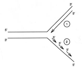 ![]() | DNAは、複製しないと増えていきません。生命であるっていうことは、自己複製することができるということです。現在の生物界では自己複製能力を持つ基本的なユニットがDNAです。 DNA複製はフォーク状に進みます。「5’末端」とか「3’末端」という言葉はよく聞きますね。これは非常に重要でして、DNAの複製というのは5’末端から3’末端にのみ進みます。 図の@では、DNA合成が開始すると、よどみなく鋳型上で3’末端にヌクレオチドが付加して3’末端が伸長します。のAでは鋳型DNAが1本鎖になった部分で短いDNAを合成し、それが最終的につながり見かけ上Aは3’−5’に伸長しているようになります。 |