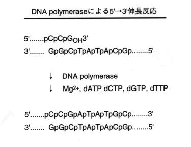 ![]() | 図に付加していく様子を示します。テンプレート上のAに対しT、Gに対しCがのって行きます。塩基同志は水素結合で結合します。また付加されたヌクレオチドは2つのリン酸がとれてホスホジエステル結合を形成します。こうして2本鎖DNAとなって行くのです。 2本鎖の間は、水素結合です。だから、温度をあげれば外れるんです、PCRの過程で94℃にすれば、水素結合が外せ1本鎖になります。この際エステル結合はきれませんから1本鎖DNAが完全なまま形成されるのです。 |