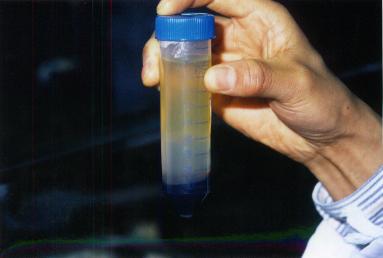 写真のごとくフィコールの上に、全血を乗せてクッションにして遠心すると赤血球と顆粒球が下に落ちて、中間層に単核球がきます。そして上が血清です。 単核球を回収し、DNAの原材料とします。なおこの分画はリンパ球が多いので以後リンパ球からのDNA抽出と称します。プロナーゼやプロテースKなどの強力な蛋白分解酵素で蛋白を分解し、フェノールにより変成蛋白を除きます。 |