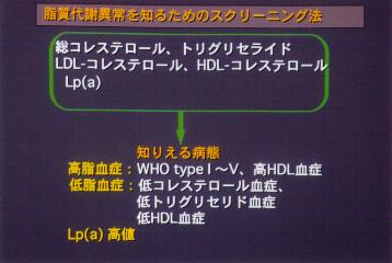 ![]() | 現在、行われている検査のなかで動脈硬化と密接に関係している高脂血症を診断するためのスクリーニングが大事だと思います。これは動脈硬化を専門にやっている先生方の話を聞いても大体こんなことであります。トータルコレステロール、中性脂肪、LDLコレステロール、HDLコレステロール、Lp(a)、この5つの検査がスクリーニングとして使われます。 今回、LDLコレステロールが保険点数で認められましたけれども、総コレステロール、LDLコレステロール、HDLコレステロールの3つのうち2つを検査として使いなさいということが厚生省からの指針として出ていますから、いったいどうするかということになりますけれども、実際、私どもの外来でやってみますと、総コレステロールからHDLとトリグリセライドの1/5を引いたFriedewald式と直接 LDL-コレステロールを測定する方法から出したデータを突き合わせてみると必ずしも一致しておりません。 |