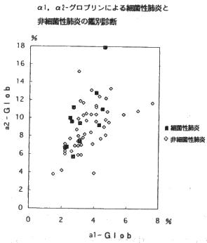 同じ症例について蛋白分画の有用性をみてみました。結果は蛋白分画は細菌性肺炎とウィルス性肺炎の鑑別診断に役に立たないということでした。ちなみにα