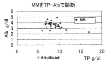 ちなみにTPとAlbの相関図からミエローマがどれだけ考えられるかですが、TPが9 g/dlを越える場合はミエローマが疑われるけれども8〜9 g/dlでは良性のものも混在します。TP値は血清蛋白分画検査へとすすめるのに少しは使える、しかし完璧ではないということです。こういうふうにしてこの場合には必ず蛋白分画をやりましょうという何らかの基準を作っていかないといけないということです。