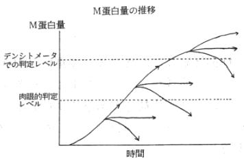 M蛋白量は病状と共に変化します。これは肉眼的にしか見えないレベル、デンシトメーターで判断できるレベル、いずれの場合においても病状とともに変化します。しかしミエローマは別にしまして、M蛋白が病状とともに変化するけれども診断や治療にどれだけ寄与するか、個々の患者にどれだけ寄与するかは別問題ですから、そこを充分考えなければいけないと思います。