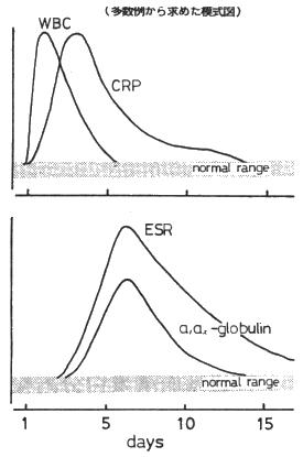 まず何がレスポンスが早いかということを検討するために急性心筋梗塞を把らえました。急性心筋梗塞は発症の時期を胸痛の出現をもってあてました。 レスポンスの速さからみると蛋白分画よりCRPの方が1〜2日位良さそうです。この点では蛋白分画は劣ります。ちなみに白血球はもっと速いです。α1とα2はあまり変わりません。血沈は蛋白分画とあまり変わりませんでした。 次に肺炎なんですが、細菌性肺炎とウィルス性肺炎の鑑別診断について桿状核球とCRPの関係をみますと、白血球は役に立たないということがまず分かりました。CRPは良い。こういうように疾患をしぼった場合、白血球は役に立たないものがあります。 |
