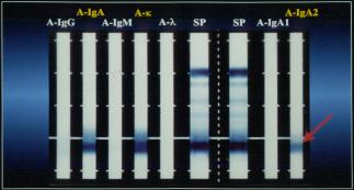 さらに、THE BINDING SITE社の抗IgAサブクラス抗血清を用い免疫固定電気泳動を行ってみますと、スライド矢印の如く、患者M蛋白は、Jacalinの実験結果と矛盾しないIgA