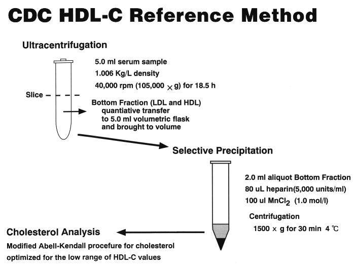 ![]() 拡大図 | 次に、CDCのHDLコレステロールの基準分析法である超遠心法は、検体(CDCとCRMLNでは、超遠心時の検体量として5mLを使用する)に比重1.006の塩化ナトリウム溶液を重層し、遠心力105,000 x G、遠心温度18度C、遠心時間18時間30分の条件下で超遠心して、上清(Supernatant)に浮上したカイロマイクロンやVLDL等のリポ蛋白をチューブスライサーで切断除去し、HDLとLDLが含まれる下層(Bottom Fraction、BF)を得ます。その後、生理的食塩水で5mLに戻してから、ヘパリン・マンガン法でLDLを沈殿させて遠心除去し、上清中のHDLコレステロールをAbell-Kendall法で定量する分析法です。 |