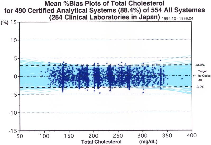 臨床検査室で標準化の認定を受けた490分析システムの総コレステロールの正確度に関するプロット図を示しました。