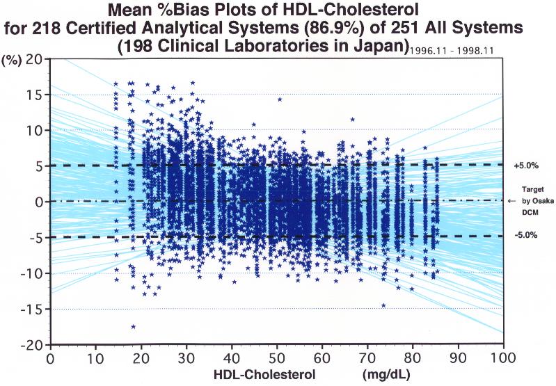 試薬メーカー側で標準化された40分析システムのHDLコレステロールの正確度に関する分布状況を示しました。