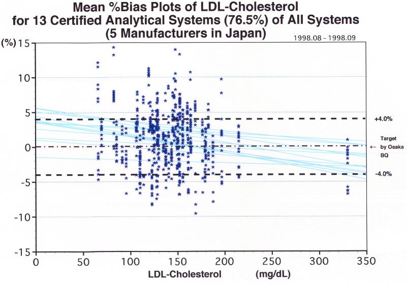 試薬メーカー側で標準化された13分析システムのLDLコレステロールの正確度に関する分布状況を示しました。