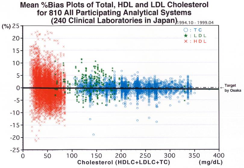 同様に、測定現場で標準化の証明された脂質3項目の計713分析システムの正確度に関する分布状況を示しました。各プロットの分布状況と回帰直線は、前述の試薬メーカーのそれを上回る成績を示しております。このことは、製品供給側の測定精度が測定現場に正確に反映されていることを示唆しているのみならず、測定現場が製品供給側のマイナス面を補っているのではないかと思われます。欧米諸国では、標準化の対象は、その効果から見て製品供給側に重い負担、臨床検査室側に少ない負担を課す方針の元に標準化システムを構築しておりますが、わが国では検査室の技術水準が高く、且つ、自己決定能力が与えられている場合が少なくありませんので、臨床検査室は試薬メーカーと同水準の標準化を消化できると思われます。しかし、この考え方は、なかなか欧米諸国に理解して貰えない面もありますが、わが国において将来、標準化の運用媒体としてのプロトコルを作成する際に考慮してよいのではないかと考えられます。 |