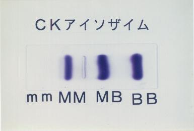 ![]() | これはCKの四つのアイソザイム、陽極側からBB、MB、MMそれからMMの陰極側にミトコンドリアのCKが出ております。このパターンは胃の抽出液ですが、胃とか小腸とかこういう所の抽出液は割合きれいに四つのアイソザイムが出て参ります。これはそのまま血中に反映される疾患もあります。CK活性を37℃で測定致しますと、基準値上限は男性であれば270単位、女性であれば200単位前後、MBが25単位ぐらいだと思います。MBのCK活性に対する割合が極端に高くなるとアイソザイムを分画して確認する必要がありますので、この割合は特に重要になります。 |