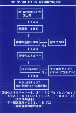 ![]() | これがマクロCKの鑑別法です。電気泳動してらっしゃる所であれば抗血清を電気泳動後に作用させますが、CKの場合には特にMMの辺りに出まして易動度の差があまりありませんので免疫交流法法とかが使い難いんです。まず、CKの上昇がある、CK対MBの割合が25%以上ある、この25%と云いますのは心筋CKがMBを含む割合です。ですからMBがだいたい25%以上になれば、MB以外の可能性があると云うことです。それから熱阻害を45℃30分で行いまして、残存活性が50%以上あれば活性化エネルギーを測ると云うことです。活性化エネルギーの測り方は、温度を30℃、今頃の自動分析装置はなかなか温度を変えられないんですけれども、30、37、40℃位でCK活性を計りまして、縦軸に活性のIn をとりましてそれから横軸に測定温度の絶対温度分の1×1000をとってプロットします。その逆の符号をとりまして変化率で割りますとグラフの傾きbがでますので、そのグラフの傾きに8.31×10−3を掛けて活性化エネルギーを計算します。この活性化エネルギーが75kJ/mol以上ありましたらミトコンドリアCK、以下であれば免疫グロブリンとの結合体ということになります。熱阻害で残存活性が50%以下になっておりましたら、おそらくこれはCK−BBということで片が付くと思います。免疫グロブリンとの複合体であれば必ず抗血清を作用させないといけないんですが、ミトコンドリアCKということになりますと残存活性と活性化エネルギーでミトコンドリアCKということを鑑別できます。 |