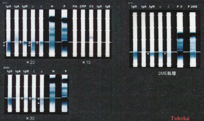 さらに血清を希釈した場合の免疫固定法です。塗布点に残るM蛋白の同定のため、血清を10倍、20倍、30倍希釈したものと、2ME処理したものにて固定法を実施しました。20倍希釈では、IgG-κ型M蛋白と同定できるものが少なくとも2ヶ所で認められました。20倍希釈で問題のM蛋白は、塗布点と塗布点以外にも認められましたが、2ME処理では塗布点に認められませんでした。塗布点に泳動していたのは、IgM-λ型M蛋白と思われます。 従って、セ・ア膜でγ分画に認められた3つのピークは、IgG-κ型M蛋白とIgM-λ型M蛋白によるものと思われます。 |