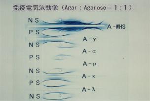 ![]() | SP膜での免疫固定法では、塗布点あたりのバンドがIgG とλに反応しましたので、IgG−λ型のM蛋白であろうということです。 スライドは免疫電気泳動像ですが、アガ−とアガロ−ス約1:1の比率で流しましたものです。そうしましたらノーマルパターンと比べましてそんなに変わらない。実はその問題の分画がちょっとした陰極側のあたりに出てくるかという推測はされてたんですが、アガ−アガロ−ス1:1の支持体では見受けられません。多少この辺りが、正常IgGのこのあたりがちょっと多いかなという感じがするんですが、この時点ではわかりません。 |
