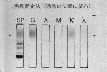 免疫固定法ですが、アガロースの支持体で通常の塗布位置にかけた場合、これはγグロブリンですが実はたまたま抗血清を通常塗布部分よりもちょっとはみ出して塗ったためにわかった分画です。だから通常やっていればもちろん出ないですね。たまたま運良くはみ出したためにわかったものです。