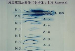 先程1:1のアガーとアガロースでは出ませんでしたので、今度は1%アガロースだけという状態で流しますと、正常に比べて、IgGより陰極部分に一本バンドが出ています。これ、よく見ますとλの所に出ています。