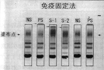 セパラックスSPで問題の血清よりもちょっと陽極、γグロブリンにかかる位の陰極側に出た2例(S−1、S−2)がたまたまありましたので、それも免疫固定法してみました。