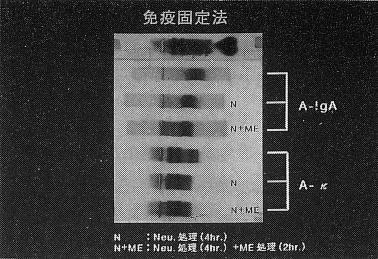 次に、Ig A−κ型の二本が、重合していないかどうかを確認するために、ノイラミニダーゼ処理後、ME処理を行いました。移動度の変化は認められず、この2本のバンドは、シアル酸が完全に切れたものと不完全な状態のものではないかと考えられます。