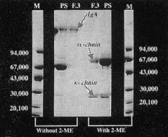 患者血清およびF3(ゲル濾過分画)の SDS-PAGEパターン ![]() | 次に患者血清及びゲル濾過によって得られたF3分画を用い、SDS−ポリアクリルアミドゲル電気泳動を行って分子量の推定をし、分子構造に異常がないかを調べてみました。 患者血清におけるIgAの分子量は16〜17万前後ですが、F3分画を2−MEで処理しα鎖、κ鎖に分けると、α鎖約6万4千、κ鎖約2万3千で、それぞれを2倍すると合計17万4千となり、IgAの分子量とほぼ一致することから、ドメインの欠損などによるIgAの構造異常は考えられませんでした。 |