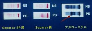 これは、支持体別による患者血清の電気泳動パターンを比較したものです。使用する膜によって泳動パターンが異なり、セパラックスSP膜では、塗布点のγ位後方からβ位にかけて、またセパラックス膜では、α