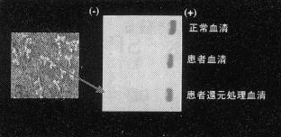 これは、2メルカプトエタノールを使って還元処理を行った後、セパラックスSP膜で電気泳動を行った結果です。
