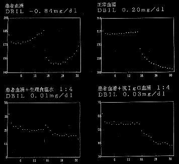 直接ビリルビンは、日本商事株式会社のネスコートD−BIL−VEを用いて能書通りに日立7070自動分析装置で測定しました。測定方法はビリルビンオキシダーゼ(BOX)を用いた酵素法です。スライドのように、患者血清ではR1緩衝液が入った時点で濁りと思われる反応を示し、R2酵素液が入ると正常反応とは違うパターンを示しました。