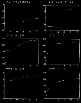 他に正常反応とは違う反応パターンを示した項目はFeとZTT、TTTがありました。その他の項目については、特に異常は認められず、正常反応と同じ反応過程を示しました。