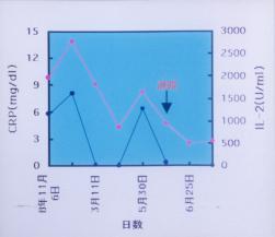 この症例の臨床経過です。CRPと非ホジキンリンパ腫や成人T細胞白血病の指標と言われております可溶性インターロイキン-2-レセプターの変動を示したものです。入院加療中から退院、現在までの変動です。退院前に両者共に高くなっているのは敗血症をおこしたためと思われます。