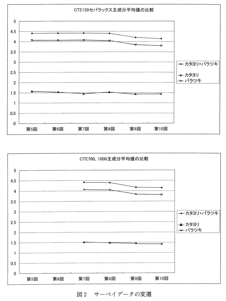 第5回でデーター分析方法について確立できたので、第5回からのCTE150セパラックス主成分平均値の比較をした。また、第7回からの新機種CTE700,1000主成分平均値の比較をした。下記折れ線グラフよりサーベイ回数を重ねる毎にカタヨリ及びバラツキが年々小さくなっていることが分かる。又装置の測定結果に対してバラツキが約90%の影響を与えていることが分かる。