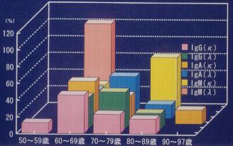 タイプ別による各年代別の発生頻度です。例えばIgG-κはどの年代で一番多いかというと、60歳代で非常に多くなってきます。
