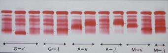 M蛋白バンドの泳動像ですが、IgG-κ、IgG-λ、IgA-κ、IgA-λ、IgM-κ、IgM-λと同じタイプのM蛋白にもかかわらず移動度が違います。この移動度のちがいと加齢が関係あるのかどうかという点に、非常に興味を持った訳です。